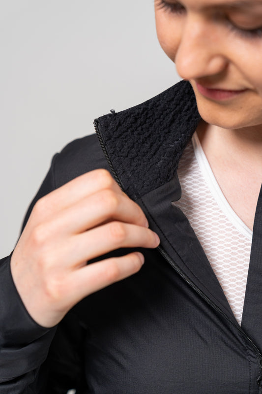Diese schwarze Radjacke für Rides im Frühjahr und Herbst für Damen: mit wind- und wasserabweisendem Außenmaterial sowie leichtem, thermoregulierendem und feuchtigkeitsregulierendem Primaloft Evolve-Futter.